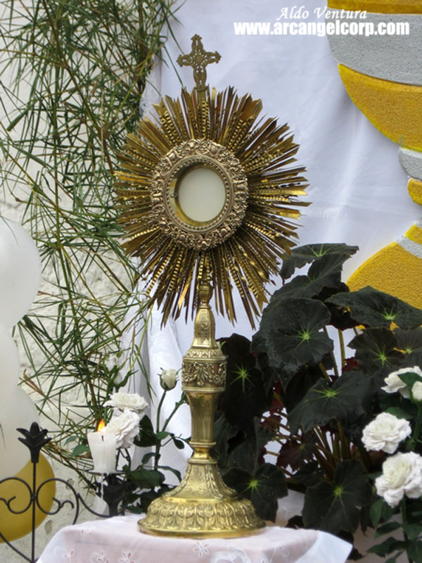 Como se muestra en las fotografías la custodia es portada por Monseñor Rodolfo Valenzuela Núñez Obispo de la diócesis de la Verapaz, también participa el Sacerdote Germán Sierra párroco de Catedral.