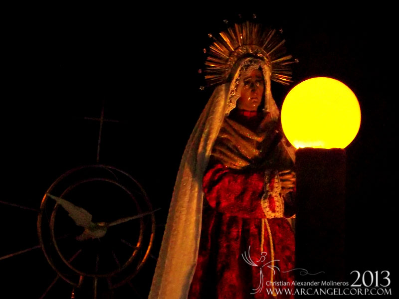 Al Frente del anda, se elevaban dos lámparas; en señal de que a la hora que María dijo si, al plan de Salvación. Encendió la luz de la esperanza, por ella encontramos a la luz del mundo, que es Cristo (Juan 8:12). Al Frente del Anda se exaltaba la Santísima Virgen de Dolores sobre un pequeño catafalco en colores barrocos, lució ataviada con una túnica color rojo y manto color blanco, ambos en estreno; donde se exaltó en el rojo la pasión de Jesucristo y el blanco representando la pureza de la Virgen María, Madre de Dios.
