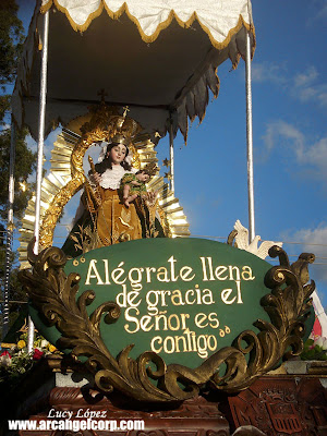 Así como el Arcángel San Gabriel Saludó a Maria para anunciarle que había sido elegida para ser la Madre de Jesús nuestro Salvador, inicia el adorno del Andas Procesional que lleva a Nuestra Venerada Imagen de la Virgen del Santísimo Rosario, y entre flores va nuestra Madre, a ella todas las flores del mundo, que muestran su belleza y reflejan su esplendor, y culmina con la frase "Bendita tu entre las mujeres y bendito es el fruto de tu Vientre Jesús", haciendo así el anuncio del niño que lleva en sus brazos en donde refleja el amor de una madre hacia su hijo amado, con un rostro bello e inspirando paz y amor a sus fieles cargadores.